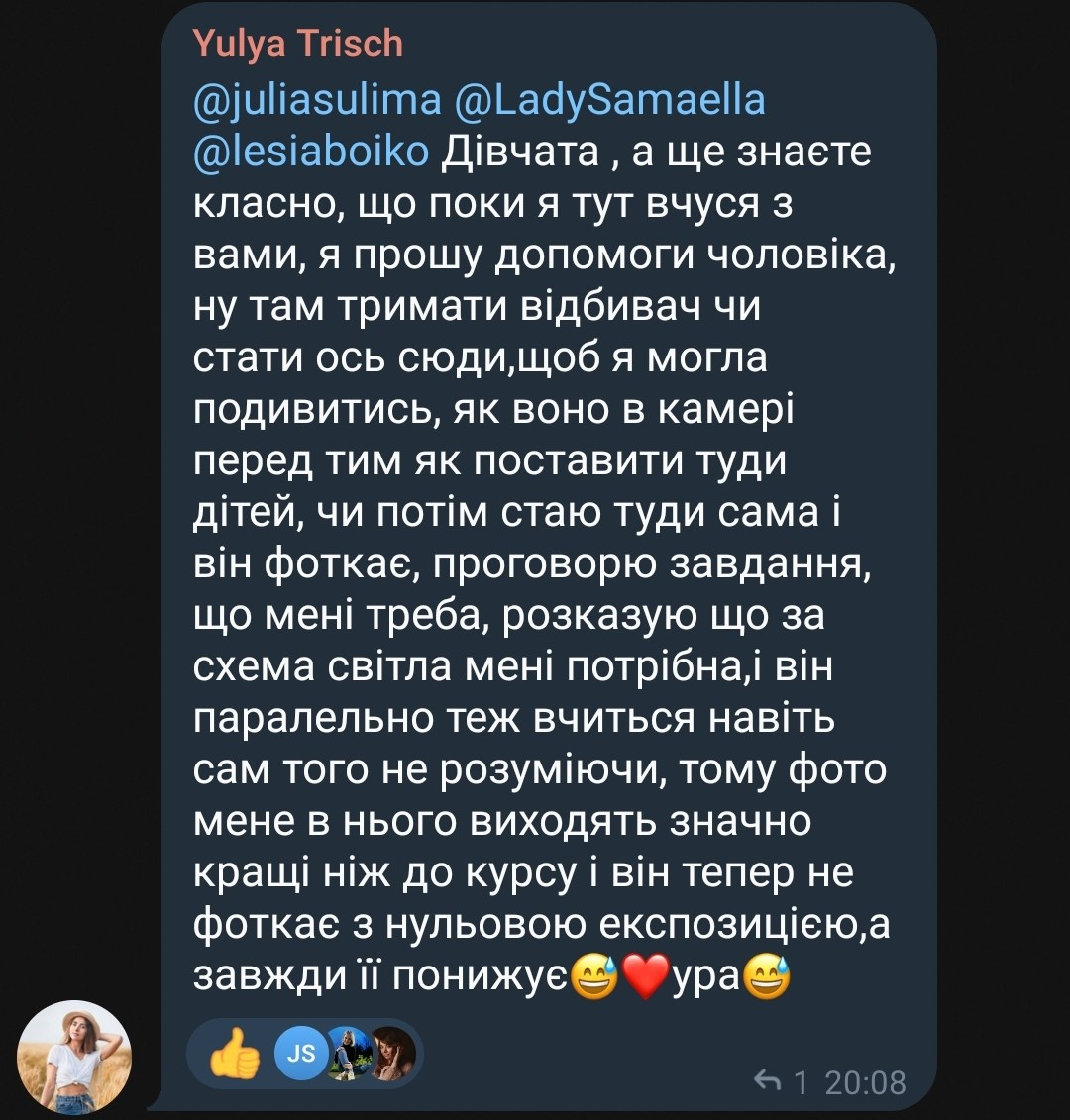 Я навчаю бачити світло вже 2 роки. Все починалось із простих марафонів у телеграм, де я публікувала завдання з короткими поясненями та розбирала роботи учасників. Але мій досвід збільшувався і збільшувався з кожним потоком.
