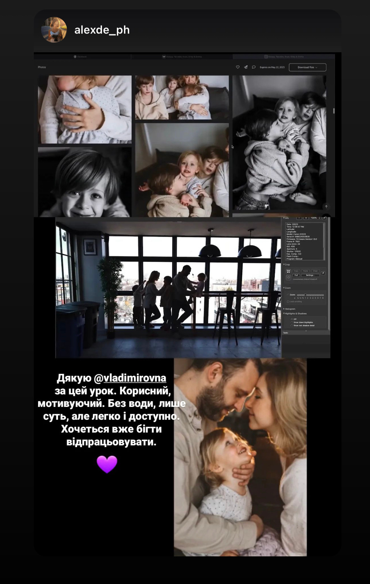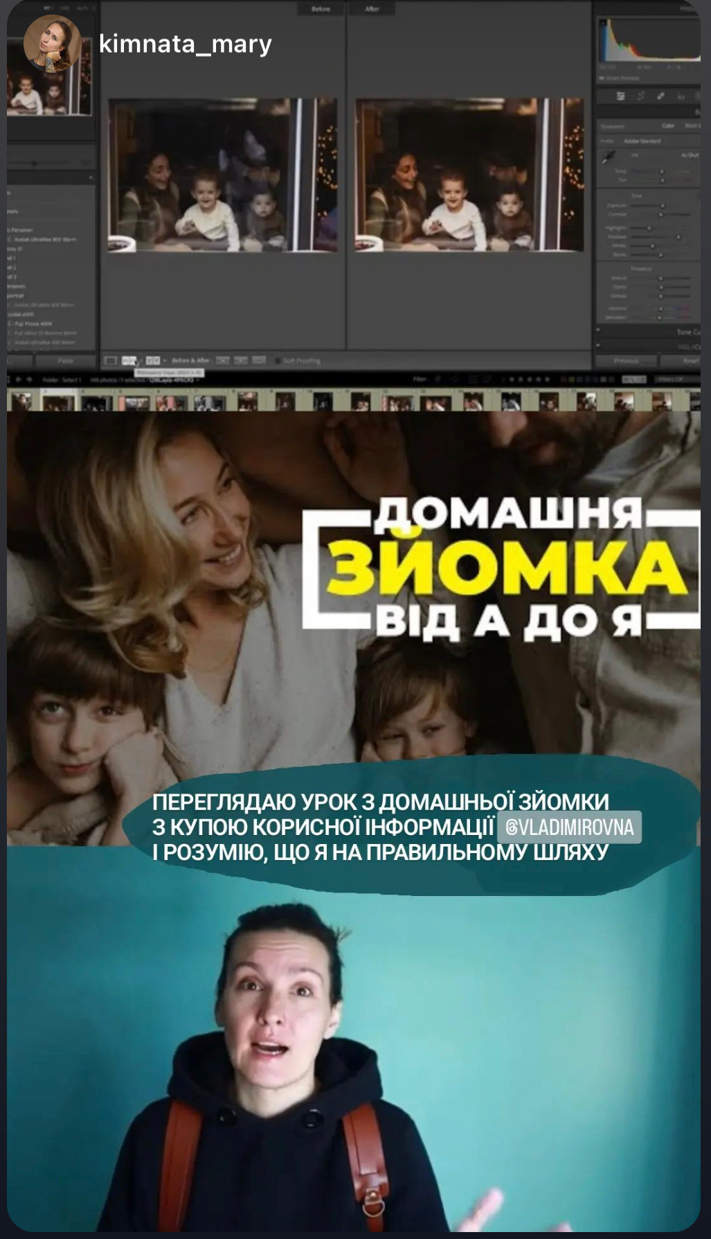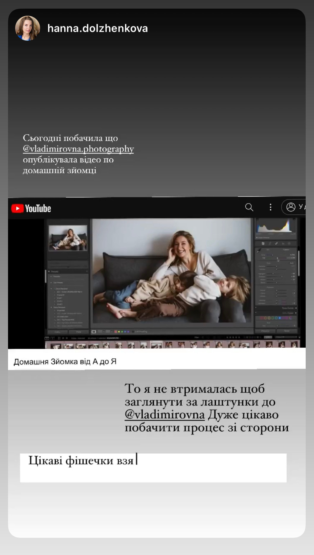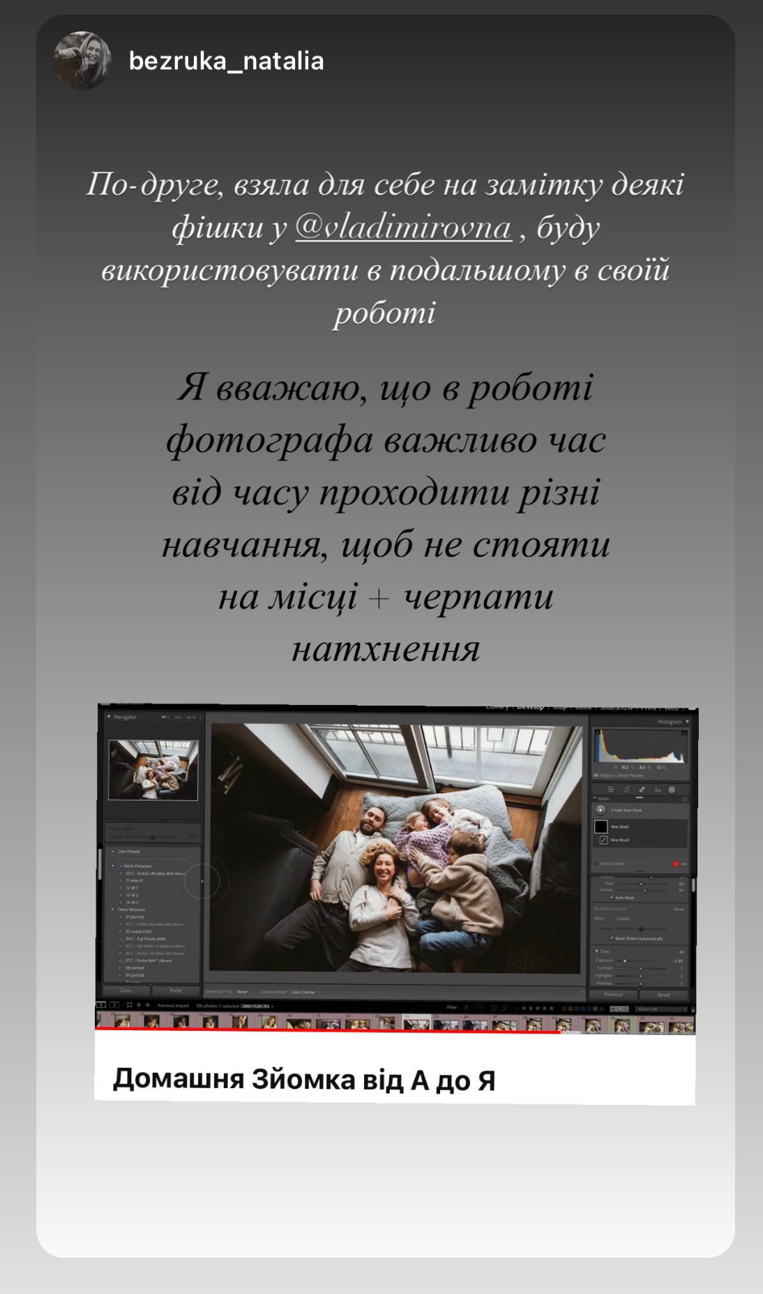 Відповіді на всі ці питання, мої особисті лайфхаки, залаштунки реальної фотосесії, а також обробка і, навіть, створення відео з фото — в новому уроці “Домашня Зйомка від А до Я”!